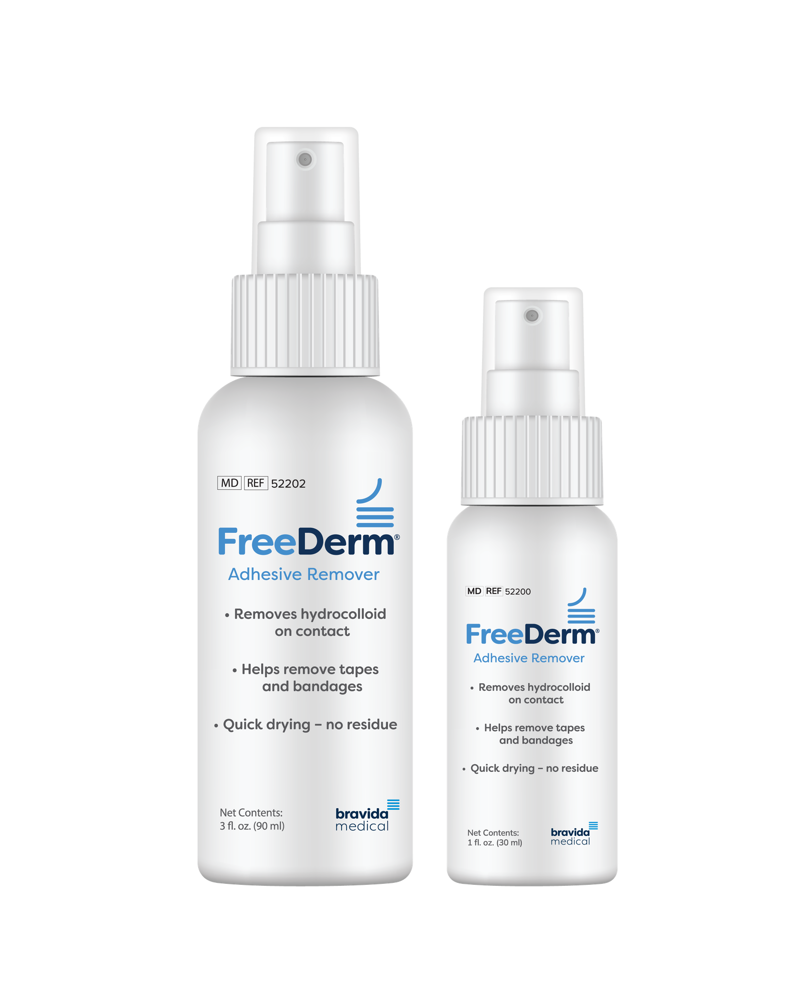 FreeDerm adhesive remover is our trademark adhesive remover. Specially formulated to instantly remove hydrocolloid tapes, and bandages, FreeDerm is available in spray or wipe form. FreeDerm adhesive remover is for external use only. FreeDerm can be used anywhere on the body where skin is intact. The formula is quick-drying and does not require washing. It is environmentally friendly and does not contain ozone-depleting chloro-fluorocarbons.