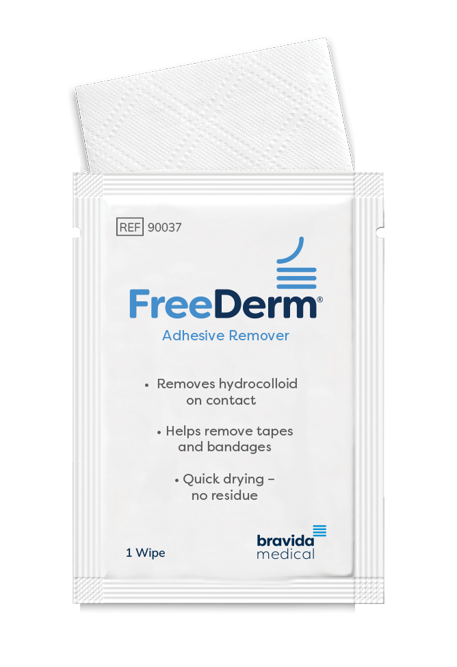 FreeDerm® adhesive remover is our trademark adhesive remover. Specially formulated to instantly remove hydrocolloid tapes, and bandages, FreeDerm® is available in spray or wipe form. FreeDerm® adhesive remover is for external use only. FreeDerm® can be used anywhere on the body where skin is intact. The formula is quick-drying and does not require washing. It is environmentally friendly and does not contain ozone-depleting chloro-fluorocarbons.