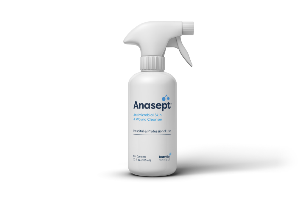 Anasept® Antimicrobial Skin and Wound Cleanser is a clear, isotonic liquid that helps in the mechanical removal of the debris and foreign material from the application site. Dirt, debris and foreign materials are mechanically removed by the action of the fluid (Wound Cleanser) moving across the wound bed or application site. Anasept Antimicrobial Skin and Wound Cleanser contains a modified broad spectrum antimicrobial agent sodium hypochlorite. It inhibits the growth of bacteria such as Staphlyococcus aureus, Psuedomonas aeruginosa, Escherichia coli, Proteus mirabilis, Serratia marcescens, including antibiotic resistant Methicillin Resistant Staphylococcus aureus (MRSA), Vancomycin resistant Enterococcus faecalis (VRE), Acinetobacter baumannii, Clostridium difficile and Carbapenem Resistant E.coli (CRE) as well as fungi such as Candida albicans and Aspergillus niger.