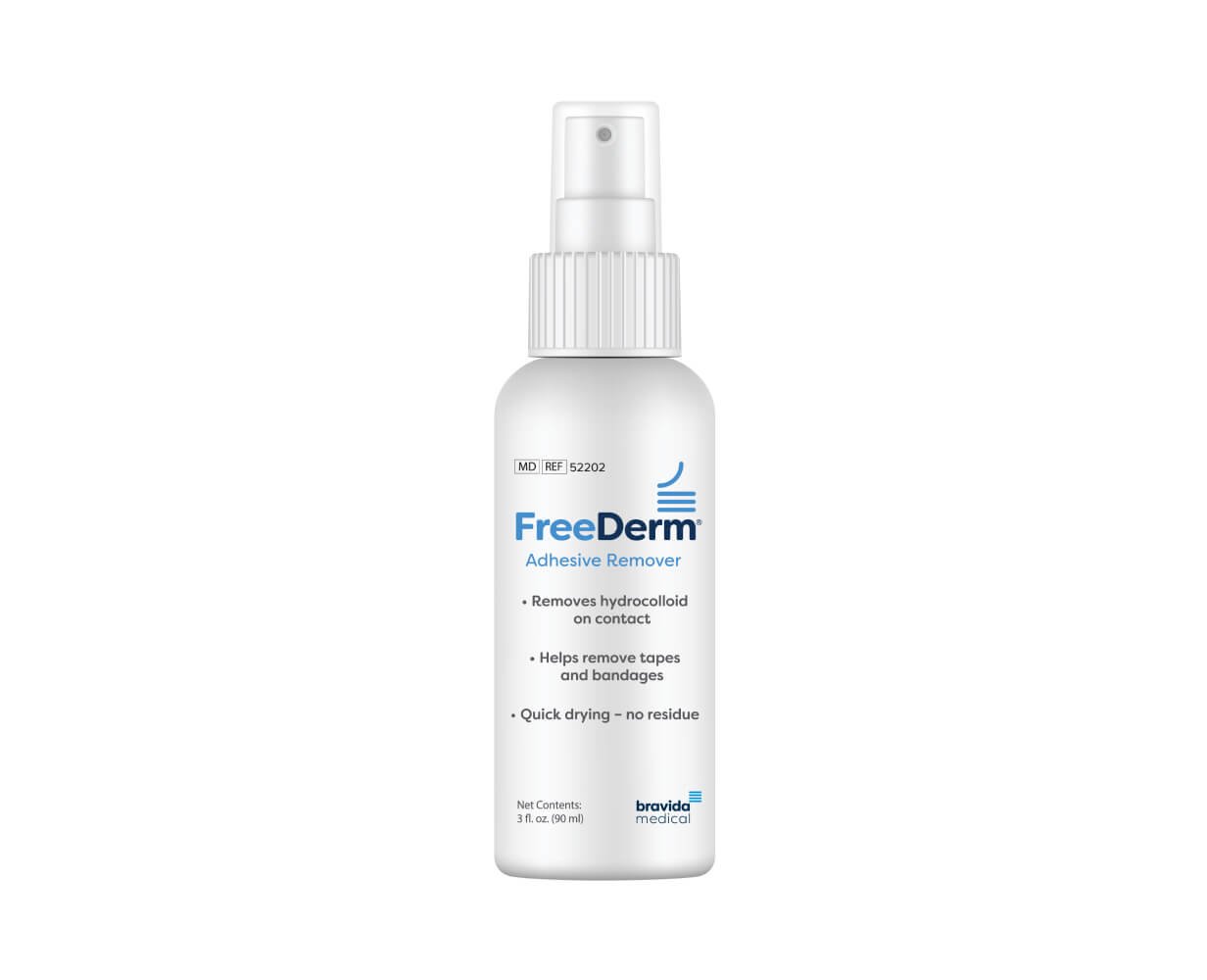 FreeDerm® adhesive remover is our trademark adhesive remover. Specially formulated to instantly remove hydrocolloid tapes, and bandages, FreeDerm® is available in spray or wipe form. FreeDerm® adhesive remover is for external use only. FreeDerm® can be used anywhere on the body where skin is intact. The formula is quick-drying and does not require washing. It is environmentally friendly and does not contain ozone-depleting chloro-fluorocarbons.