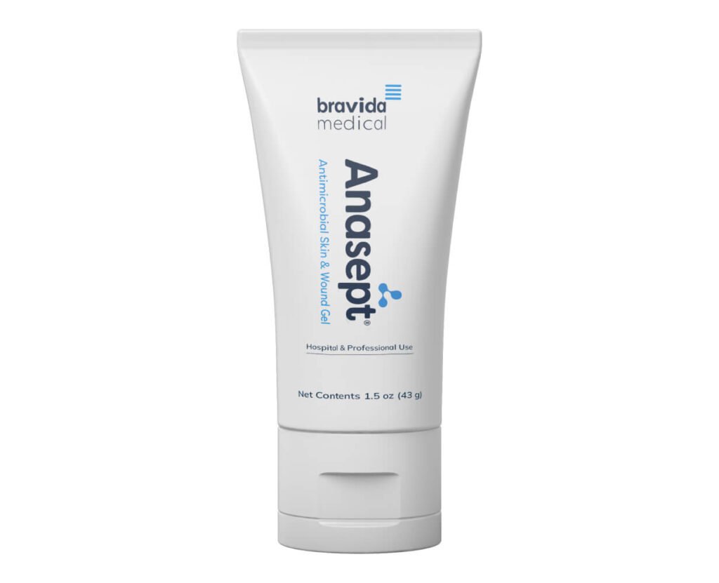 Anasept® Antimicrobial Skin and Wound Gel is a clear, amorphous, isotonic hydrogel that helps maintain a moist wound environment conducive to healing, by either absorbing wound exudate or donating moisture while delivering a unique blend of 0.057% broad-spectrum antimicrobial sodium hypochlorite.
