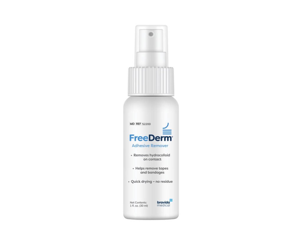 FreeDerm adhesive remover is our trademark adhesive remover. Specially formulated to instantly remove hydrocolloid tapes, and bandages, FreeDerm is available in spray or wipe form. FreeDerm adhesive remover is for external use only. FreeDerm can be used anywhere on the body where skin is intact. The formula is quick-drying and does not require washing. It is environmentally friendly and does not contain ozone-depleting chloro-fluorocarbons.